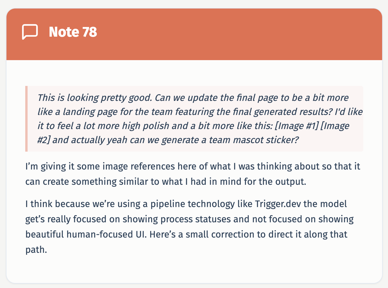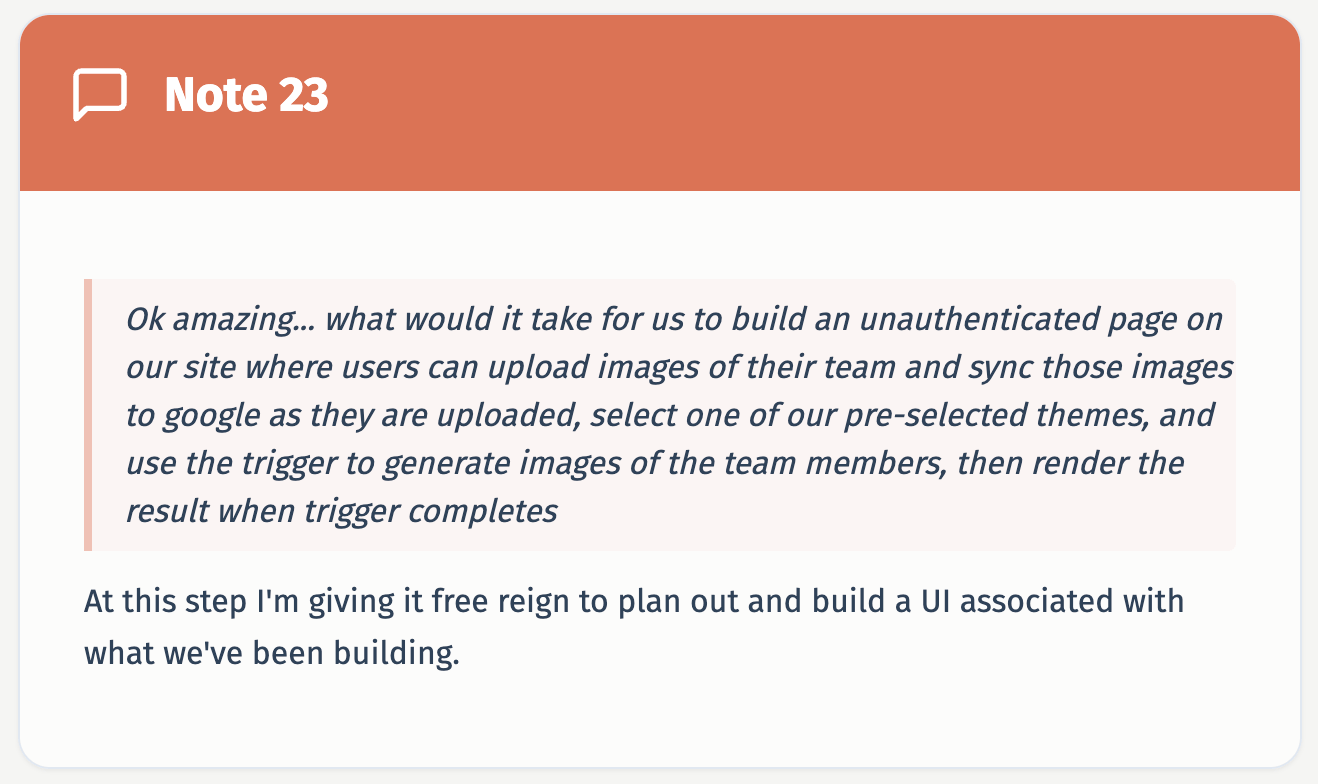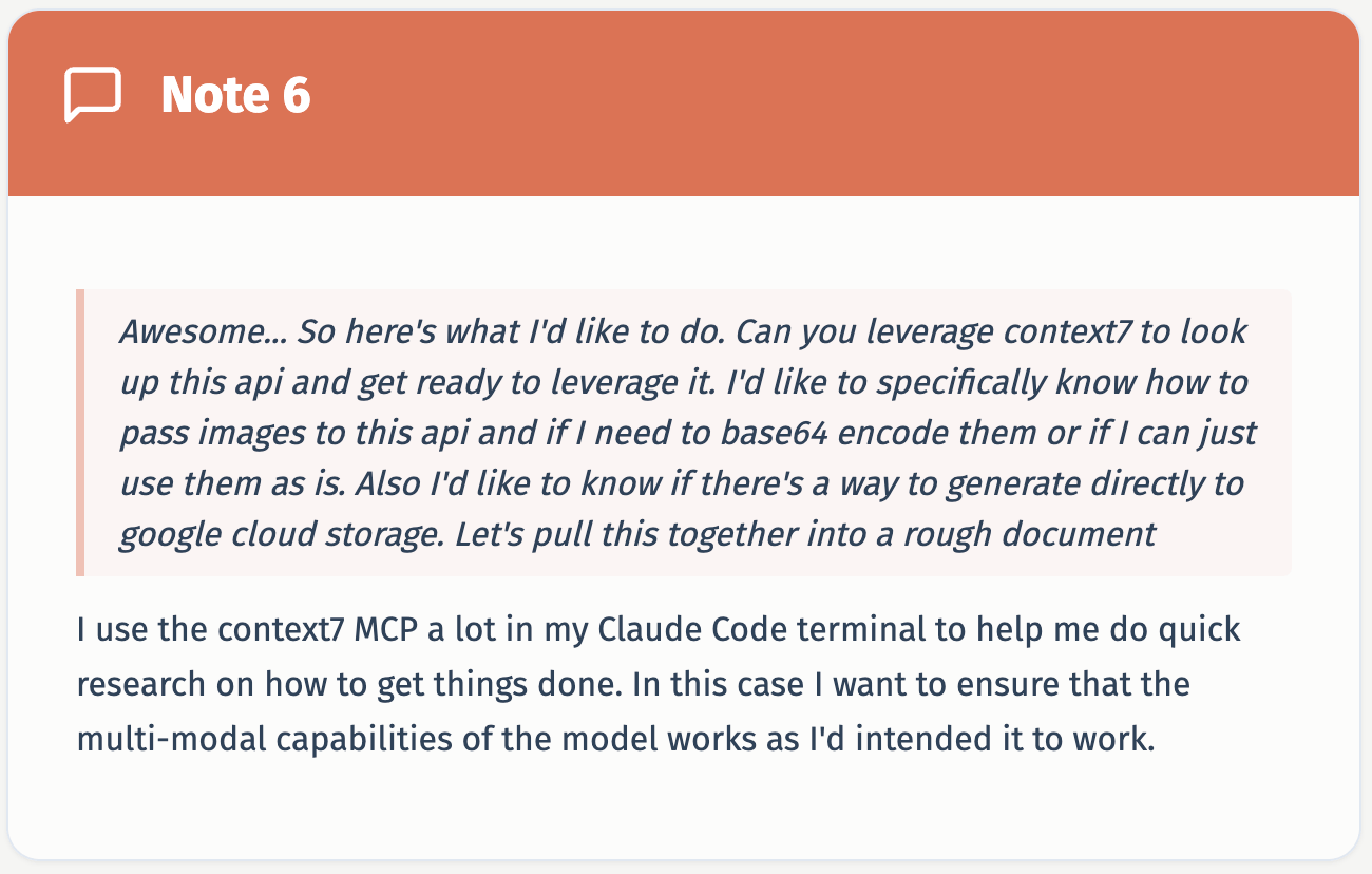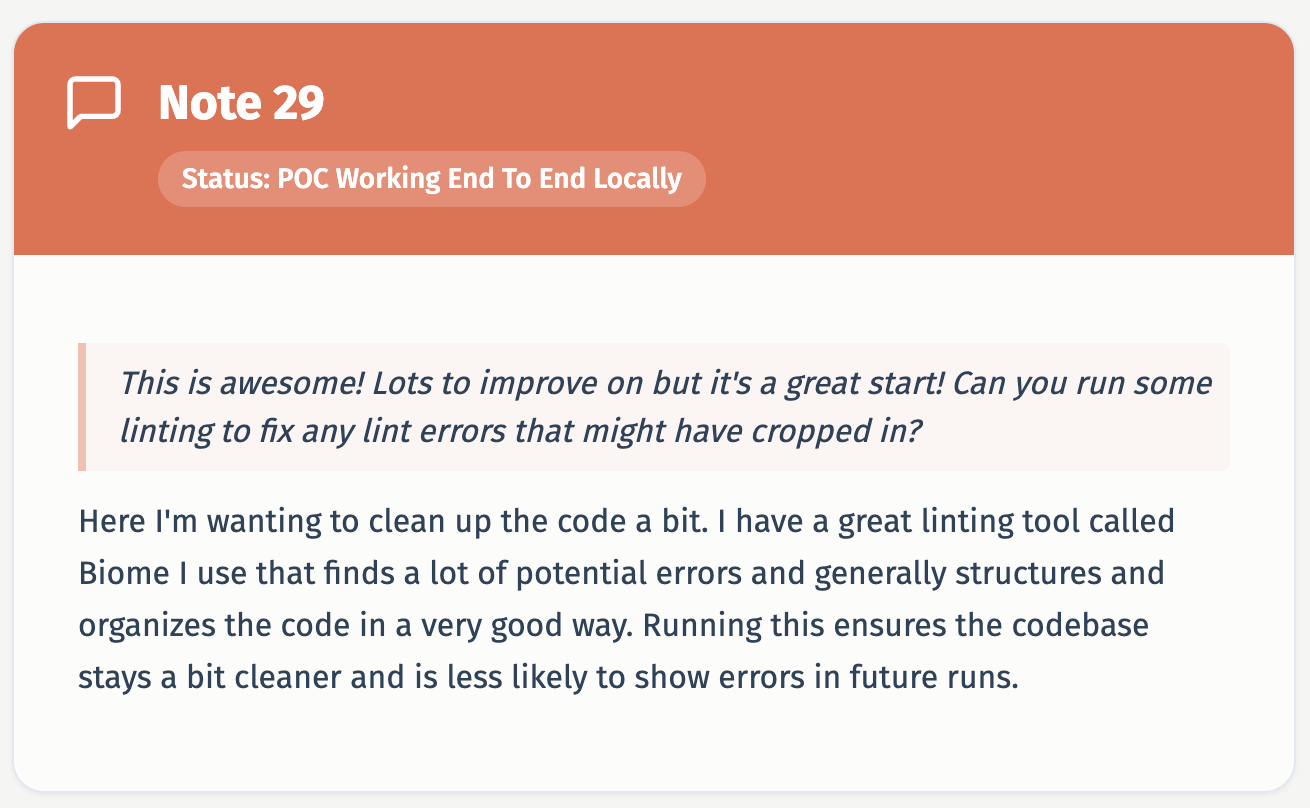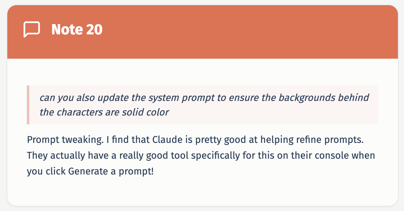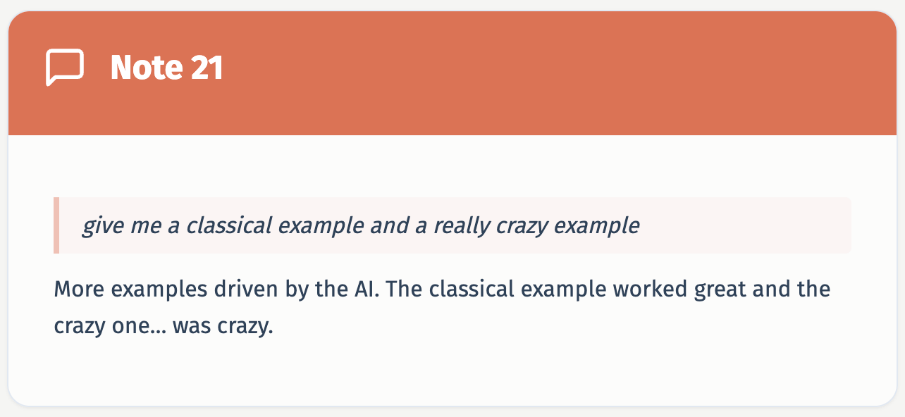 For each note, you’ll notice the note number (message number), a quoted text that indicates the message I sent the AI, and a description that details what I was doing at each step. For example, the first major message I sent was this one: